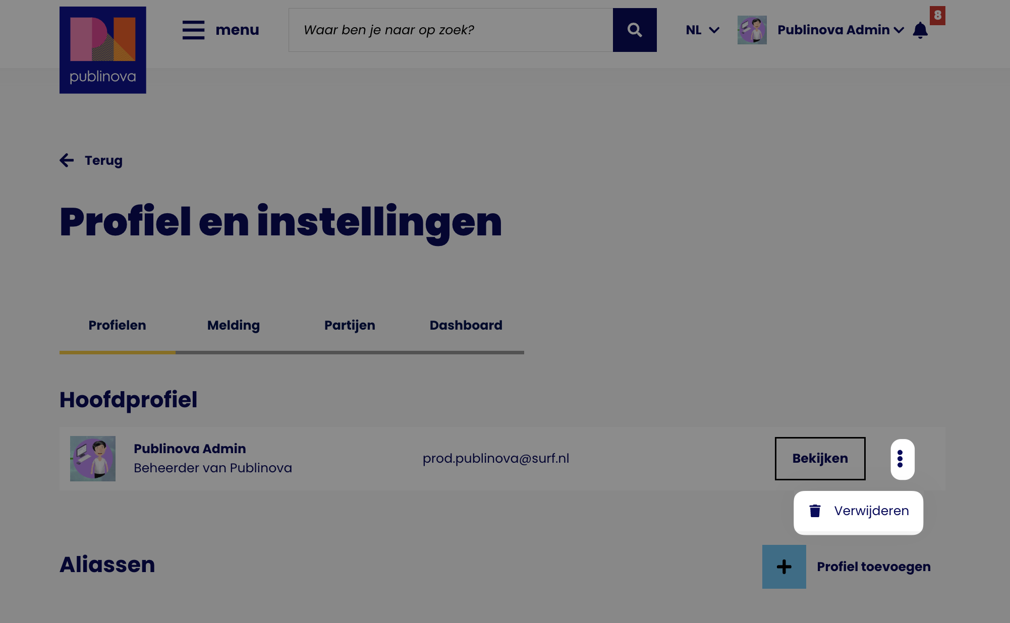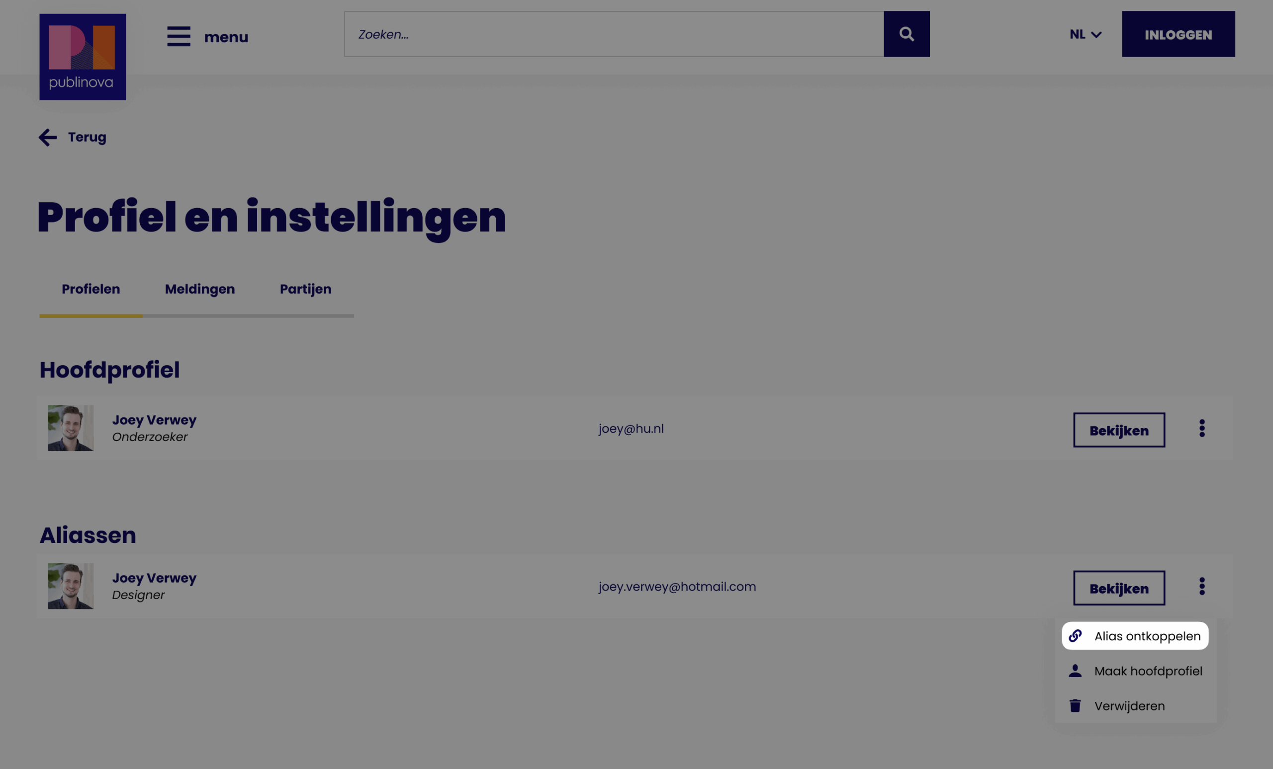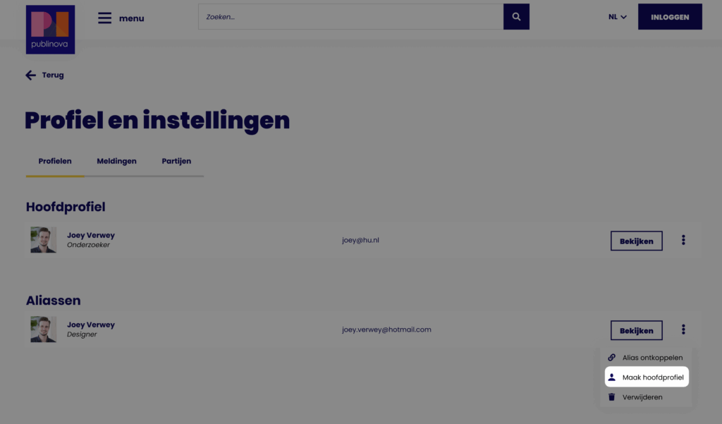 Dit dubbele profiel wordt aan je hoofdprofiel gekoppeld als alias. Alle producten en projecten die gekoppeld zijn aan de alias worden ook zichtbaar bij je hoofdprofiel.