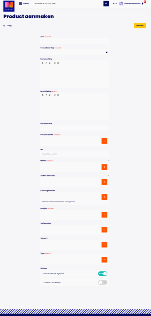 - Partijen: Je product wordt onder de partij aangemaakt waarmee je hoofdprofiel mee is verbonden. Voeg hier extra (samenwerkings)partijen toe. Staan ze er nog niet in voeg ze dan toe onder partij beheer. Zie handleiding; Lectoraten of andere partijen aanmaken.