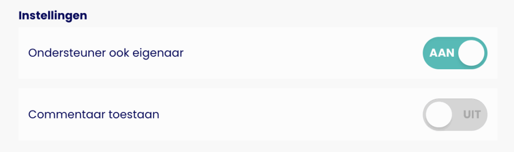 eigenaar: Als deze schuif aan staat kan de ondersteuner van de partij je product of project ook bewerken. Wij raden aan om deze aan te zetten zodat we weesproducten kunnen voorkomen. - Commentaar ook toestaan: Het kan zijn dat je instelling heeft bepaald reacties onder het product of project uit te zetten. Als dat zo is staat hij standaard uit.